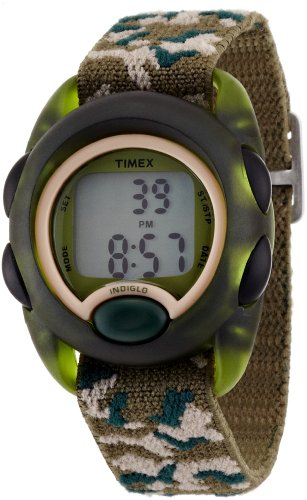 The Timex T71912 Youth digital watch is reliable, durable, and readable in the dark, thanks to the integrated Indiglo night-light, but it's also flat-out fun to wear. It features an easily readable digital display with large, recognizable icons for the chrono, alarm, and timer functions, and a comfortable elastic fabric strap (for better dirt and stain resistance) with camouflage pattern. This watch also offers water resistance to 30 meters (99 feet), 12/24-hour time, durable translucent olive resin case, large function buttons, and Timex's unique Kids Loss Protection Plan. It's recommended for children ages 6 and older.<p> The Indiglo night-light uniformly lights the surface of the watch dial using patented blue electroluminescent lighting technology. It uses less battery power than most other watch illumination systems, enabling your watch battery to last longer. The Night Mode feature allows you to illuminate the Indiglo night-light for 3 seconds with any button press, regardless of the mode or function. <p> Timex understands that kids often lose things, even their most prized possessions, which is why this watch is covered by the Timex Kids Loss Protection Plan. If the watch is lost, Timex will replace it with the same style (or similar if your style is not available) at the price of $10 for up to one year from the original date of purchase, with no questions asked. Details are included in the printed instructions that come with the watch.